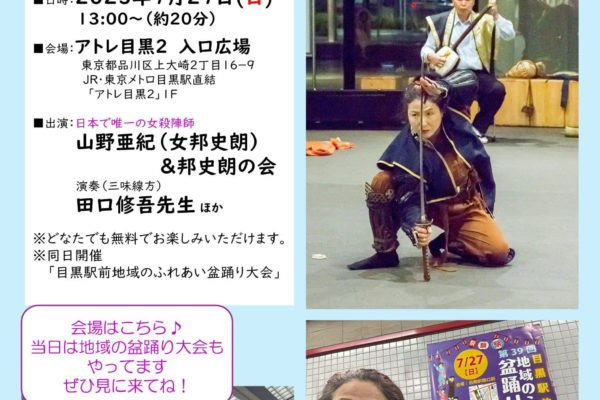 ●2025年7月27日13時、JR目黒駅アトレ2入口広場山野亜紀(女邦史朗)が、津軽三味線+尺八奏者の田口修吾さんとコラボ演武を行います。どなたでも無料でお楽しみいただけます。お気軽にご参加下さい。…